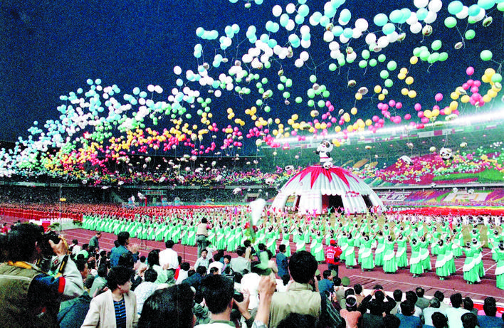 1990年9月22日至10月7日,第十一屆亞運(yùn)會(huì)在北京舉行。這是中國(guó)首次舉辦國(guó)際綜合性運(yùn)動(dòng)會(huì)。圖為開幕式現(xiàn)場(chǎng)。 新華社發(fā)