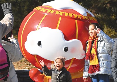 2月20日,在北京市海淀區(qū)冬奧文化廣場,小朋友與“雪容融”合影留念。新華社記者 任 超攝