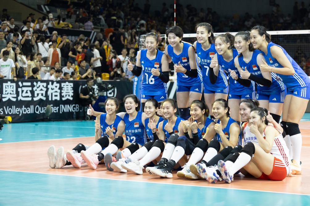 9月17日,中國隊球員在賽后合影。當日,在浙江省寧波市舉行的巴黎奧運會女排資格賽A組比賽中,中國隊以3:0戰(zhàn)勝墨西哥隊。新華社記者 張濤 攝
