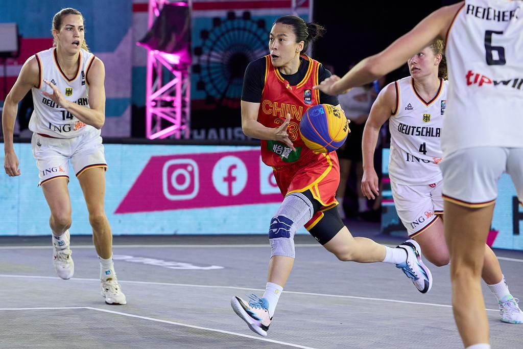 6月3日,中國(guó)隊(duì)球員王麗麗(中)在2023國(guó)際籃聯(lián)三人籃球世界杯女子組四分之一決賽中突破。新華社發(fā)(喬治斯·施耐德攝)