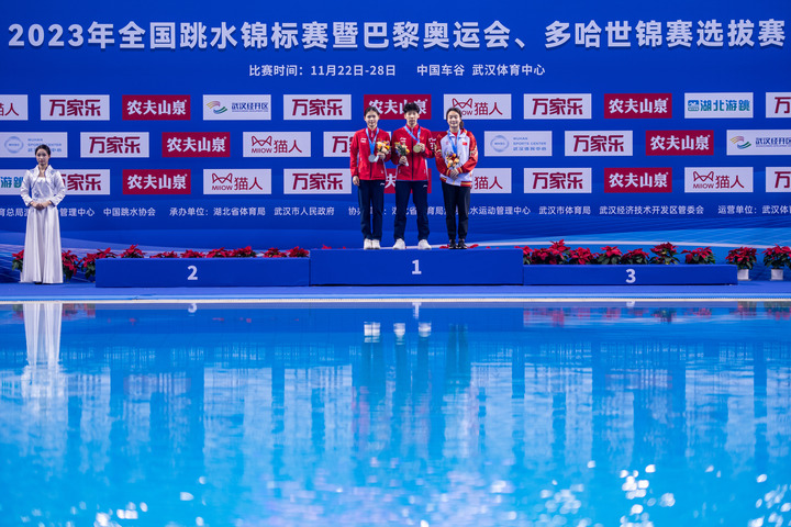 11月23日,女子1米板前三名選手在頒獎儀式上。新華社記者伍志尊攝