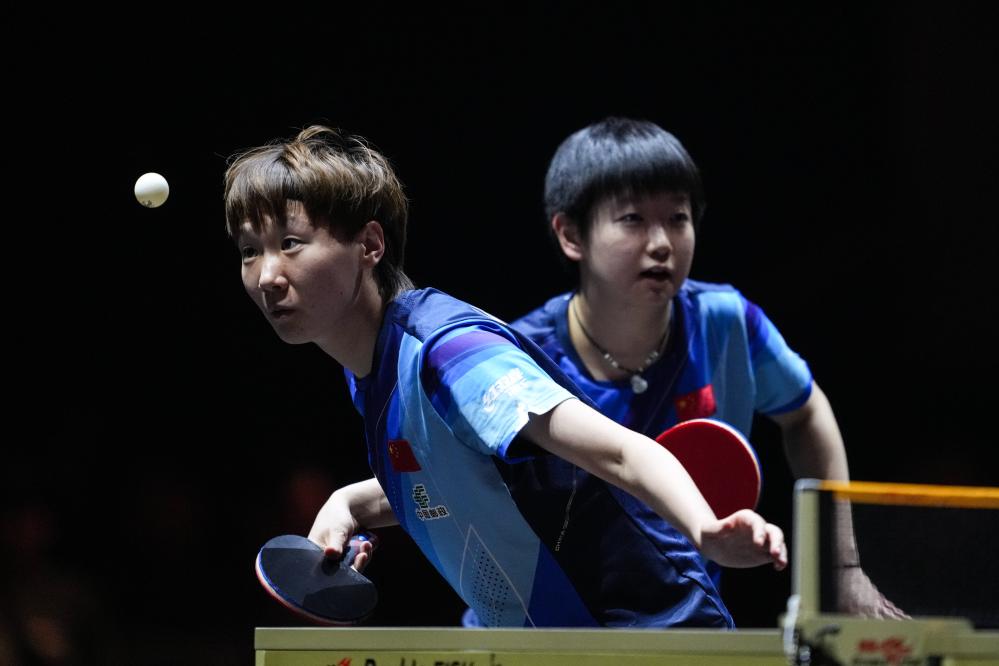 12月17日,孫穎莎/王曼昱(左)在比賽中。新華社記者張笑宇攝