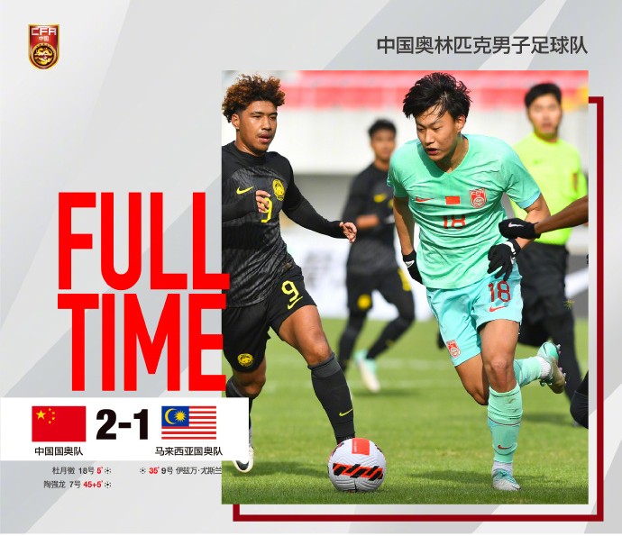 開場后,中國國奧隊就采取高位逼搶。第5分鐘,杜月徵接陶強龍開出的前場任意球破門,打破僵局。第34分鐘,巴沙遠射擊中橫梁,尤斯蘭補射破門幫助馬來西亞隊扳平比分。上半時補時階段,中國隊獲得禁區(qū)內(nèi)間接任意球機會,陶強龍破門,將比分改寫為2:1。易邊再戰(zhàn),17歲小將王鈺棟替補登場,首次代表中國國奧隊參賽。雙方在下半場未取得進球,2:1的比分保持到了終場。