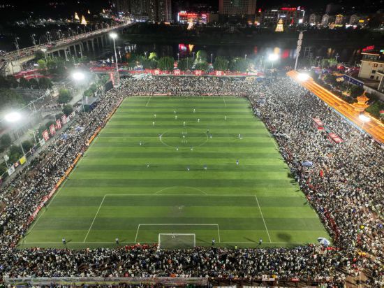 這是7月29日拍攝的夜幕下的“村超”總決賽現(xiàn)場(chǎng)(無(wú)人機(jī)照片)。新華社記者 歐東衢 攝