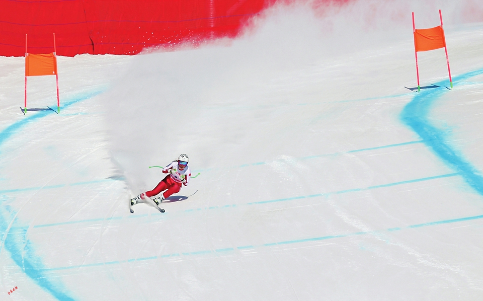 高山之巔,白雪之上,滑雪運動員在落差高達547米的雪道上滑降,他們穿行、回轉(zhuǎn),快似閃電,如雪上飛燕。
