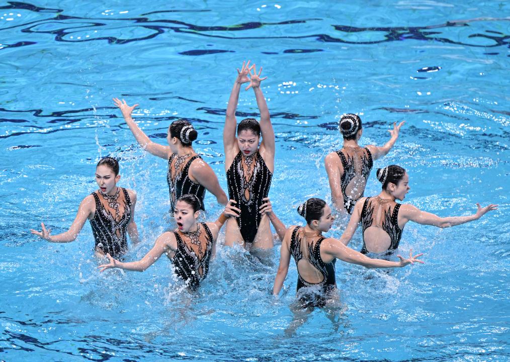 4月7日,中國隊在比賽中。當(dāng)日,在國家游泳中心“水立方”舉行的2024年花樣游泳世界杯(北京站)集體技巧自選比賽中,中國隊以205.0300分的成績獲得亞軍。新華社記者 夏一方 攝
