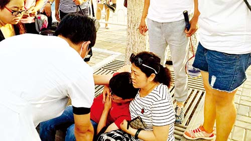 劉增芬大姐懷抱突發(fā)疾病的青年、 配合醫(yī)務(wù)人員進(jìn)行血壓心電圖檢測