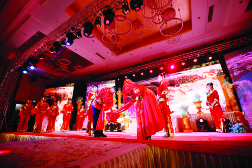 “秉父母之命,承媒妁之言,今日,新人喜結(jié)連理,諸賓共睹,天地同鑒,于此,新人三拜。一拜,感天地之造化,緣分天賜,德行地載。愿天地賜福,婚姻美滿,天長地久。再拜,婚姻之意義,為延續(xù)生命,推進文明。上以繼父母之血統(tǒng),下以開萬代之文化。三拜,今夕何夕,得此良人。愿此生忠貞不二,矢志不渝?!痹谔咸宵S河和大紅燈籠的映襯之下,一對身著中式婚禮服的新人隆重登場。鳳冠霞帔、紅花禮帽,古樸而莊重,喜氣又脫俗。民歌《想親親》道出了一對新人浪漫甜蜜的愛情故事,悠揚嘹亮的嗩吶聲吹響了幸福的號角,一對甜蜜的新人在親朋好友的簇擁之下邁入洞房。中式婚禮秀《想親親》讓現(xiàn)場的每一位觀眾感同身受,秀容大地的獨特風俗文化在一場婚禮秀中體現(xiàn)得淋漓盡致。