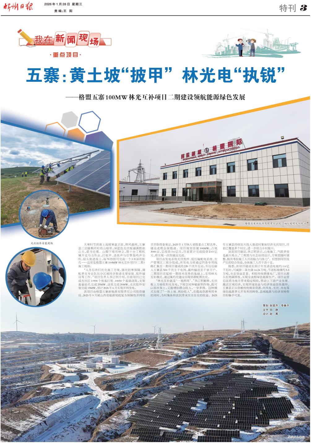 大寒時(shí)節(jié)的黃土高坡寒意正濃,朔風(fēng)凜冽,五寨縣三岔鎮(zhèn)柳河村的山坳里,深藍(lán)色光伏板鋪滿數(shù)座山頭,蔚為壯觀。山腳下塔吊林立,數(shù)十臺(tái)工程機(jī)械開足馬力作業(yè),打樁聲、澆筑聲與引擎轟鳴聲交織,鉆頭旋進(jìn)凍土,每70秒即可完成一個(gè)3米深的樁孔——這里是格盟五寨100MW林光互補(bǔ)項(xiàng)目(二期)施工現(xiàn)場(chǎng)。