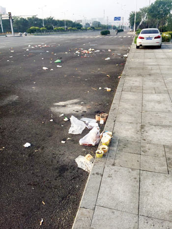 城區(qū)高鐵廣場前,慕山路與雁門大道丁字路口,每天晚上有小商販在此經(jīng)營,本無可厚非,但每天產(chǎn)生的垃圾,既影響市容環(huán)境,還給環(huán)衛(wèi)工人增加了工作量,呼吁市民及小商販愛護環(huán)境,也希望相關部門管理維護公共環(huán)境。一網(wǎng)友攝于8月22日