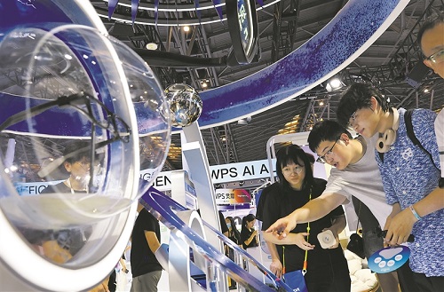 參觀者在2025世界人工智能大會(huì)現(xiàn)場(chǎng)的一個(gè)智能眼鏡展臺(tái)前交流討論。新華社記者 方喆攝