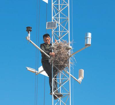 沙林中心科研人員對(duì)沙塵觀測(cè)塔進(jìn)行維護(hù)。