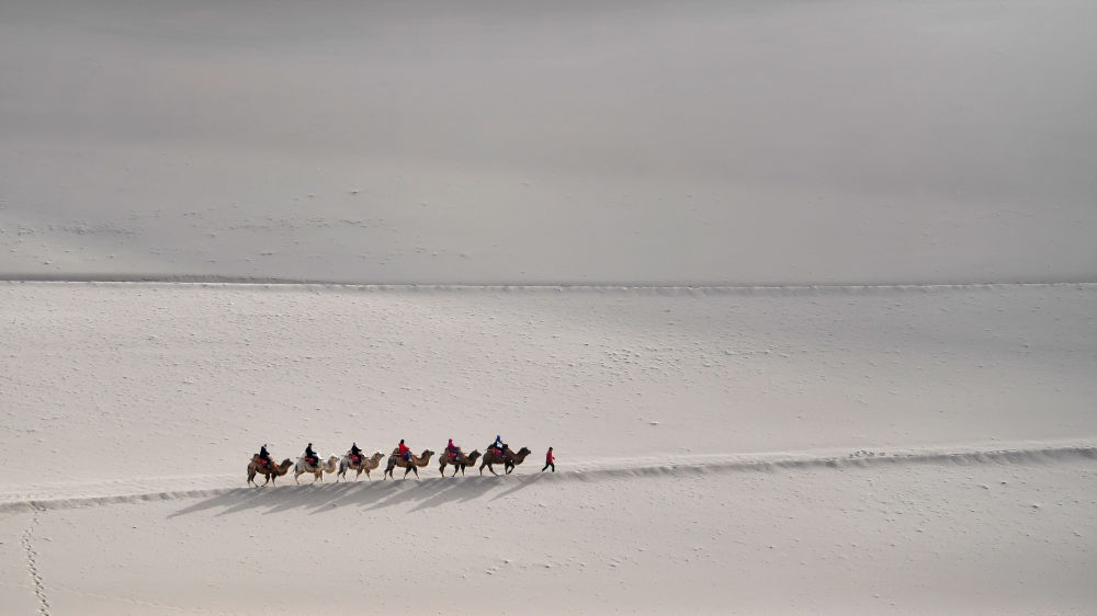 駝隊載著游客行走在鳴沙山月牙泉景區(qū)的駝道上(2023年4月24日攝)。新華社記者 陳斌 攝