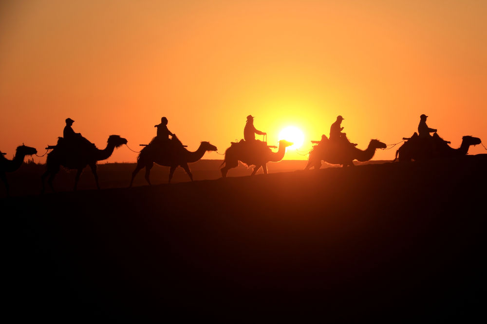 游客騎著駱駝在敦煌鳴沙山月牙泉景區(qū)游覽(2023年6月7日攝)。新華社發(fā)(張曉亮攝)