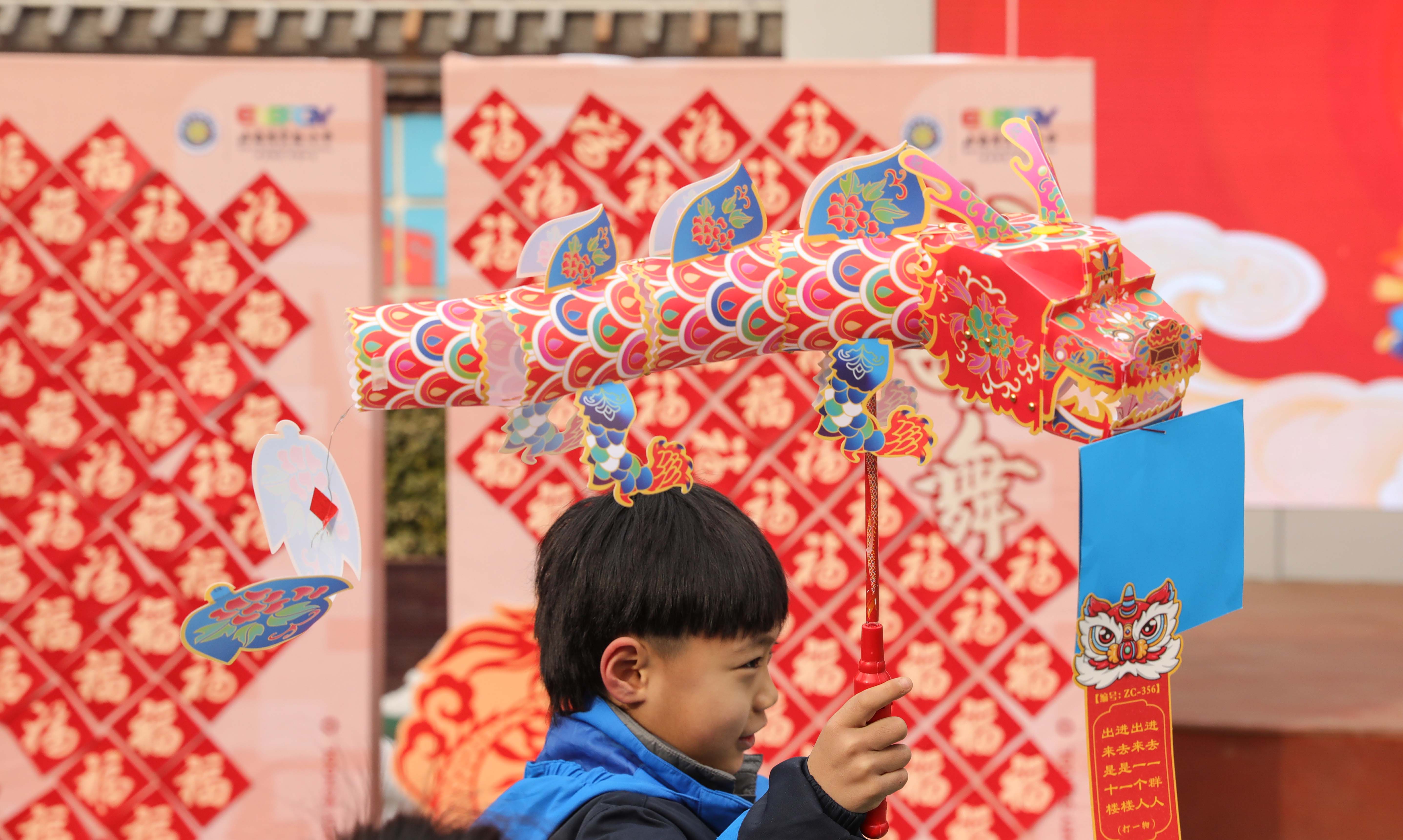 摘龍燈環(huán)節(jié),孩子們被一個(gè)長約一米的龍燈吸引,高高昂起的龍頭、橙藍(lán)相間的龍身、腳踏祥云似要飛騰。仔細(xì)一看,龍燈上還掛著一張紅色的心愿卡片,小主人閆雨卓寧用拼音加漢字寫出了自己的龍年心愿“身體棒棒、個(gè)子高高”。