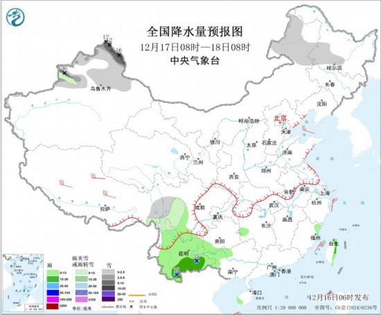 12月17日08時至18日08時,內(nèi)蒙古東北部、黑龍江西南部、新疆北部、川西高原南部等地部分地區(qū)有小到中雪或雨夾雪,其中,新疆阿勒泰地區(qū)和伊犁河谷局地有大到暴雪(10~16毫米)。西南地區(qū)南部、湖南西部、福建東北部、廣西西北部、海南島西南部等地部分地區(qū)有小到中雨,其中,云南東南部局地有大雨(25~35毫米)。西藏中北部等地部分地區(qū)有4~6級風;東海南部海域、臺灣海峽、巴士海峽、南海東北部和中東部海域?qū)⒂?~7級大風、陣風8級。