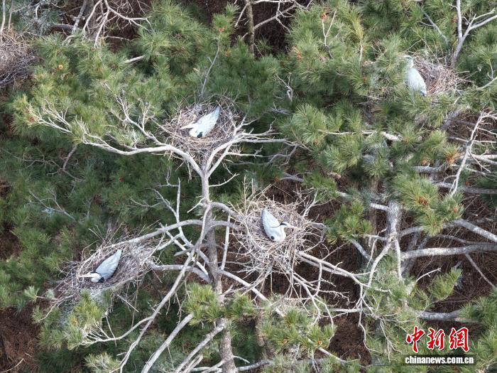 在蒼鷺棲息區(qū),錯(cuò)落有致地分布著多個(gè)白色鳥巢。趙鵬帥 攝