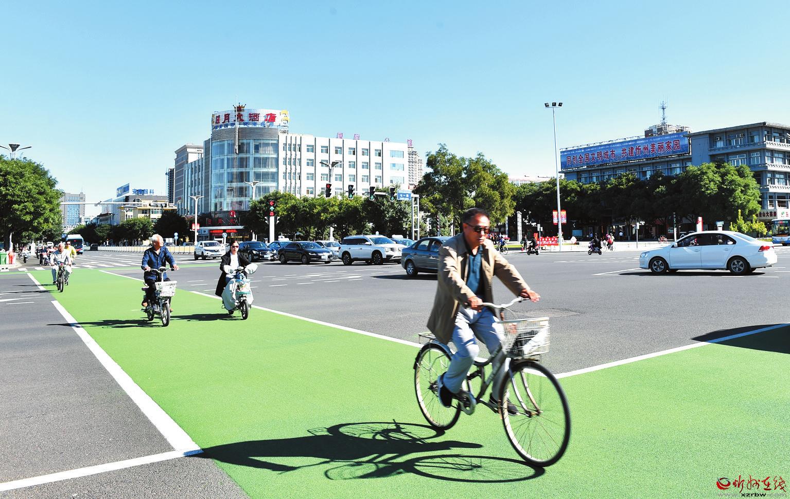 9月3日,市民在忻州城區(qū)七一路與長(zhǎng)征街交叉路口的自行車(chē)專(zhuān)用道上騎行。日前,忻州路面上出現(xiàn)人車(chē)分離“斑馬線(xiàn)”,行人走斑馬線(xiàn)、騎行則走專(zhuān)用自行車(chē)道,很好地實(shí)現(xiàn)了人和非機(jī)動(dòng)車(chē)分流通過(guò),為創(chuàng)建文明城市增色。 宮清華 攝