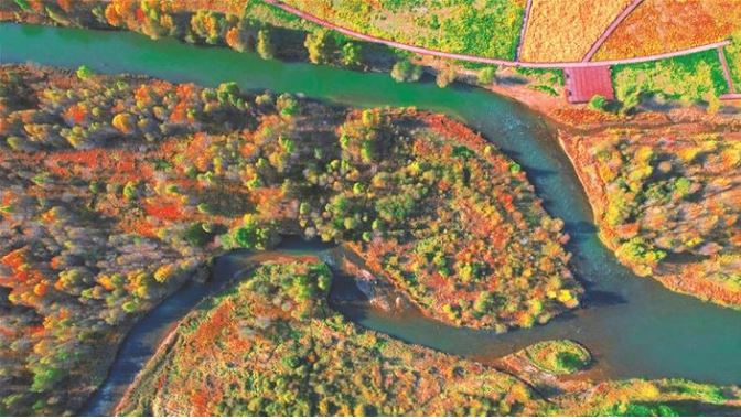 10月14日,航拍鏡頭下的靜樂(lè)汾河川國(guó)家濕地公園,秋意濃濃,景美如畫(huà)。 本報(bào)記者 張存良攝