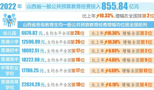 山西日?qǐng)?bào)訊(記者任志霞)日前,教育部、國家統(tǒng)計(jì)局、財(cái)政部發(fā)布了2022年全國教育經(jīng)費(fèi)執(zhí)行情況統(tǒng)計(jì)公告(以下簡(jiǎn)稱統(tǒng)計(jì)公告)。統(tǒng)計(jì)公告顯示,2022年山西省一般公共預(yù)算教育經(jīng)費(fèi)投入855.84億元,比上年增長(zhǎng)10.33%,增幅在全國排第2位。
