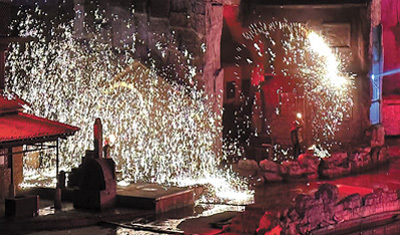 大年初七,晚上7點(diǎn),山西省晉城市司徒小鎮(zhèn)的山水實(shí)景劇《千年鐵魂》準(zhǔn)時(shí)開(kāi)演。當(dāng)臺(tái)上的幾位工匠將金黃色的鐵水一齊拋灑向天空,絢爛的鐵花在空中綻放,氣勢(shì)磅礴。觀(guān)眾的情緒也在此刻到達(dá)頂峰。
