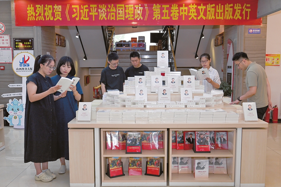 七月三十一日,山西圖書大廈內(nèi),讀者正在閱讀《習(xí)近平談治國理政》第五卷。申晉光攝