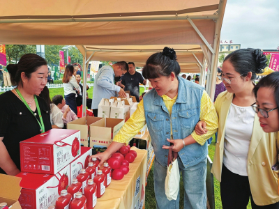 臺上歡歌快舞慶豐收,臺下熱熱鬧鬧逛大集。產(chǎn)品展銷現(xiàn)場,人頭攢動、熱鬧非凡,游客品嘗豐收美食、體驗豐收喜悅。售賣農(nóng)產(chǎn)品的農(nóng)民嗓門大、笑容甜:“郊區(qū)西南舁的蘋果,嘎啦脆,您嘗嘗!”“平定的黃瓜干,好吃,有嚼勁!”“今天剛從地里摘的老南瓜,又糯又甜!”“家里走地雞下的蛋,特別香!”