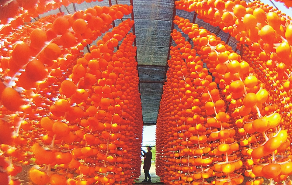 金秋時節(jié),山西省運(yùn)城市新絳縣陽王鎮(zhèn)禪曲村的柿子迎來豐收,連片金黃的果實(shí)掛滿枝頭。在該村種植加工大戶許永安的“家庭微工廠”,柿農(nóng)們正忙著將柿子削皮加工、上架晾曬。
