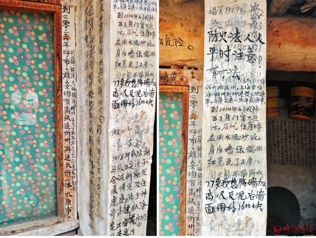 這幾天,忻州代縣峨口鎮(zhèn)上高陵村的一個老院子火了!院子的主人是一位叫張福青的老人,他把院中的老屋當(dāng)成“日記本”,一筆一畫,在磚墻上、門框上、房梁上、門楣窗欞上,密密麻麻地寫滿了文字。這些文字書寫著他作為一個普通人認真生活的一生,讓人讀完不禁熱淚盈眶。