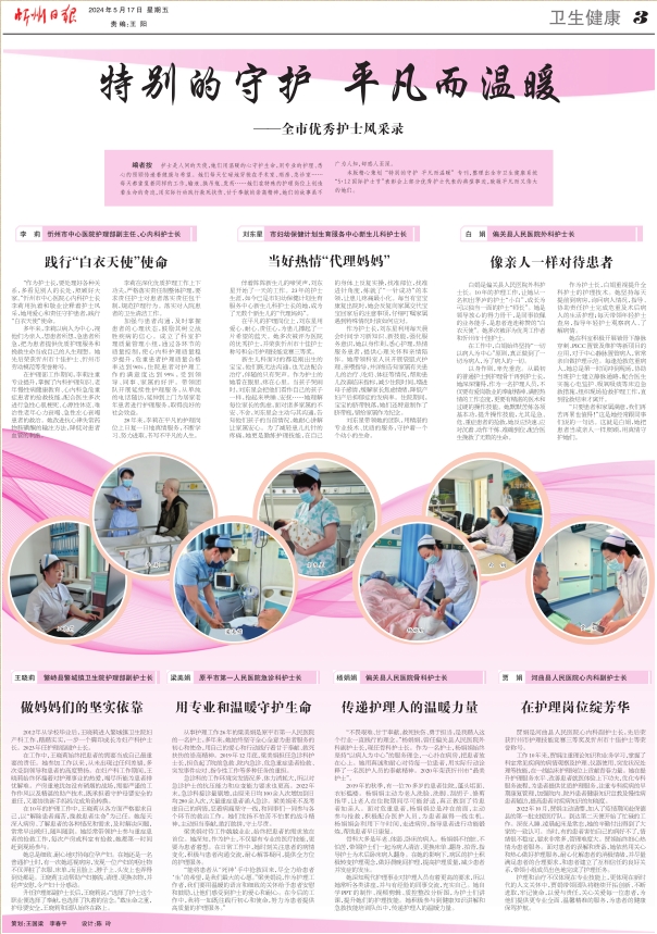 本版精心策劃 “特別的守護(hù) 平凡而溫暖” 專(zhuān)刊,整理出全市衛(wèi)生健康系統(tǒng)“5·12國(guó)際護(hù)士節(jié)”表彰會(huì)上部分優(yōu)秀護(hù)士代表的典型事跡,致敬平凡而又偉大的她們。