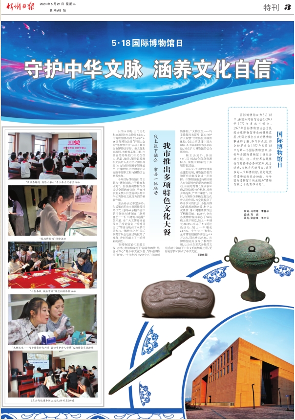 近年來,忻州的文博事業(yè)蓬勃發(fā)展,博物館的教育和研究功能得到進一步發(fā)揮。市博物館通過持續(xù)開展具有資源特色的品牌教育活動,積極培育群眾生活新風(fēng)尚,深化館校合作機制,為青少年提供了“第二課堂”。同時,市博物館積極發(fā)揮文化育人的作用,為全民提供了終身學(xué)習(xí)的機會,為提升群眾的思想道德素質(zhì)、科學(xué)文化素質(zhì)、身心健康素質(zhì)作出了積極貢獻。2023年,全市各類博物館共舉辦了55場線上線下展覽,較上一年增長21.05%;舉辦了515場社教活動,較上一年增長24.70%。今年“五一”假期,全市博物館接待游客達6.9萬人次,同比增長27.3%。市博物館充分發(fā)揮了教育作用,讓公眾在形式多樣的文化活動中領(lǐng)略了中華文明的輝煌歷程,更好地守護和傳承了中華文化。(梁春霞)