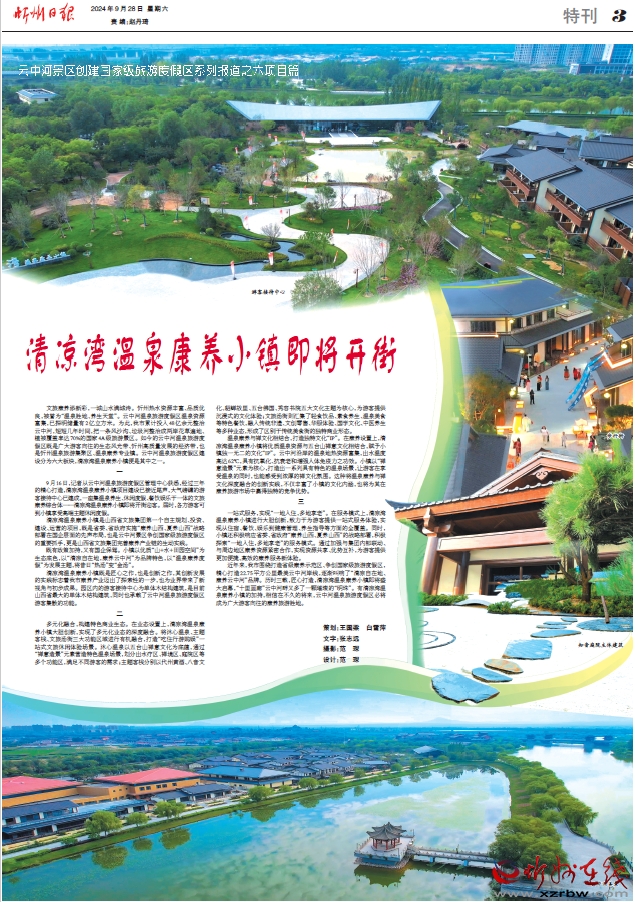 文旅康養(yǎng)添新彩,一城山水滿城詩。忻州熱水資源豐富、品質(zhì)優(yōu)良,被譽(yù)為“溫泉勝地、養(yǎng)生天堂”。云中河溫泉旅游度假區(qū)溫泉資源富集,已探明儲量有2億立方米。為此,我市累計投入48億余元整治云中河,短短幾年時間,把一條風(fēng)沙溝、垃圾河整治成兩岸花草遍地、植被覆蓋率達(dá)70%的國家4A級旅游景區(qū)。如今的云中河溫泉旅游度假區(qū)既是廣大游客向往的生態(tài)風(fēng)光帶、忻州高質(zhì)量發(fā)展的經(jīng)濟(jì)帶,也是忻州溫泉旅游集聚區(qū)、溫泉康養(yǎng)專業(yè)鎮(zhèn)。云中河溫泉旅游度假區(qū)建設(shè)分為六大板塊,清涼灣溫泉康養(yǎng)小鎮(zhèn)便是其中之一。