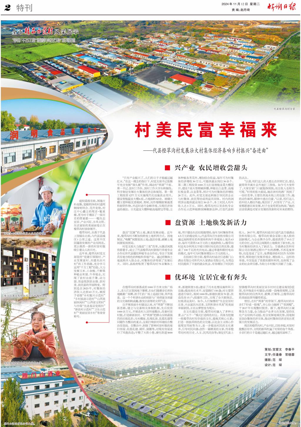 “只有產(chǎn)業(yè)振興了,人們的日子才能越過越紅火。”在這一理念的指引下,村黨支部書記張繼平充分發(fā)揮“領(lǐng)頭雁”作用,調(diào)動村“兩委”干部、第一書記、駐村工作隊、到村工作大學生積極性,科學制定發(fā)展壯大集體經(jīng)濟總體規(guī)劃。第一期工程投資1277萬元實施現(xiàn)代化設(shè)施農(nóng)業(yè)項目,建設(shè)智能溫室大棚6座,占地面積52畝。玻璃大棚主要種植優(yōu)質(zhì)桃樹、棗樹,間作矮棵耐寒蔬菜和耐陰作物,并適時進行金蟬養(yǎng)殖,實現(xiàn)經(jīng)濟效益的疊加。日光溫室大棚種植高端甜寶草莓,立體種植各類花卉,增加綜合收益,每年可為村集體經(jīng)濟增收30萬元,可提供就業(yè)崗位30余個。第二期工程投資1000萬元打造智能韭菜大棚項目,建設(shè)7座大型棉被拱棚,種植長白韭菜、高端紅根韭菜、漢韭菜等,預(yù)計可為村集體經(jīng)濟增收20萬元。此外,村黨支部還積極引導(dǎo)民營企業(yè)與村集體、農(nóng)民等結(jié)成利益共同體。村內(nèi)的潤明餅業(yè)提供就業(yè)崗位50余個,務(wù)工村民人均年收入達3萬元。同時,橙草溝村巨發(fā)農(nóng)機專業(yè)合作社示范種植韓國辣椒新品種,打造代縣特色試點。