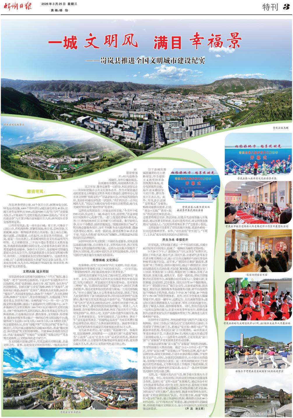 山西省岢嵐縣,是一座生態(tài)小城。夏日里,可漫步于山間小徑,聽松濤陣陣、賞繁花似錦;秋日里,層林盡染、五彩斑斕,宛如一幅絢麗多彩的山水畫卷。登上高山之巔,極目遠(yuǎn)眺,云海翻涌、山巒起伏,壯美景色盡收眼底。岢嵐,更是一方紅色熱土,革命精神和紅色文化在這里代代相傳。毛主席路居館、三井戰(zhàn)斗遺址等愛國主義教育基地,承載著那段波瀾壯闊的歷史,記錄著革命先輩們的英勇事跡和崇高精神。2025年5月23日,全國精神文明建設(shè)表彰大會在北京召開,岢嵐縣榮獲第七屆全國文明城市稱號,陽坪村、三井鎮(zhèn)榮獲全國文明村鎮(zhèn)稱號。這座晉西北小城,以“小縣城也能創(chuàng)造大奇跡”的信念奮力攻堅(jiān),五年來攻堅(jiān)克難、久久為功,終繪就出“環(huán)境優(yōu)美、秩序井然、和諧幸?!钡奈拿鞔鹁怼?/p>