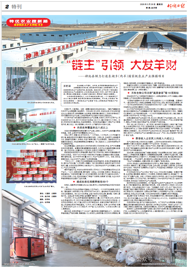 作為神池現(xiàn)代農業(yè)產業(yè)示范區(qū)“鏈主”企業(yè),天牧生物已構建起一條集種羊繁育、生態(tài)養(yǎng)殖、精細屠宰、精深加工、中央廚房、冷鏈物流、銷售平臺、綠色餐廳于一體的全“羊”完整產業(yè)鏈。目前,公司擁有2座現(xiàn)代化種羊場、6座萬只生態(tài)肉羊養(yǎng)殖基地、1條年屠宰15萬只羊生產線、1條年精深加工3000噸肉羊生產線以及1座現(xiàn)代化中央廚房,有效促進了縣域肉羊全產業(yè)鏈發(fā)展。