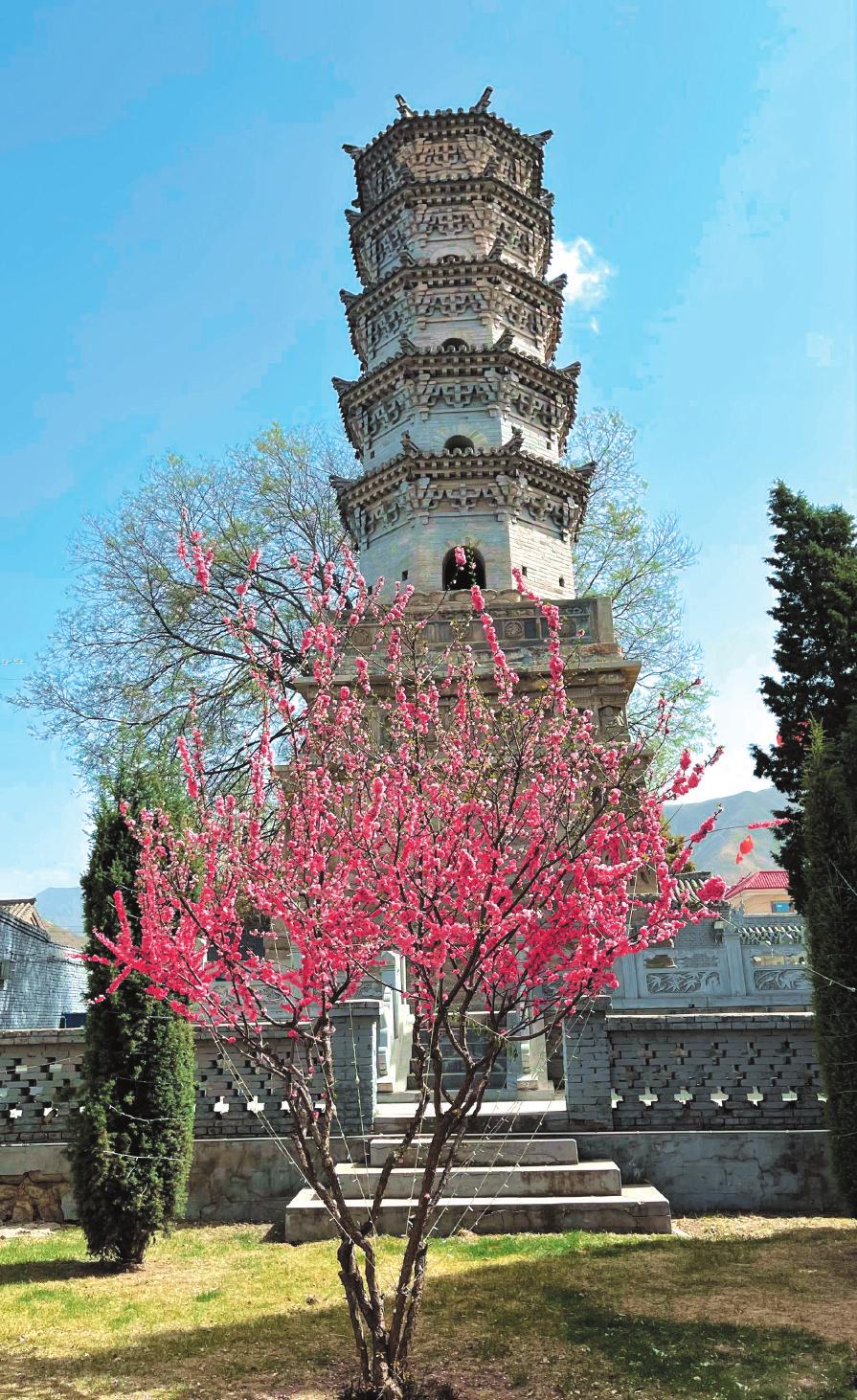 磚塔坐北朝南,占地面積75.7平方米,通高約19米,為八角五層樓閣式磚石塔。塔基石砌,平面呈方形,由上下兩部分組成,底邊長8.7米,高6.6米。下層每面兩側(cè)浮雕金剛各1尊,南側(cè)辟券門成塔室,上層為須彌座,束腰處每面雕屋形龕9個(gè),內(nèi)雕坐佛各1尊,其上設(shè)圓形仰蓮?fù)兴?,四周設(shè)勾欄。塔身平面呈八邊形,五層中空,每層塔檐下設(shè)仿木磚雕斗拱,五踩重昂,各層四面均設(shè)有券洞,八角攢尖頂,中央設(shè)覆缽,寶珠塔剎。2004年公布為省級文物保護(hù)單位。