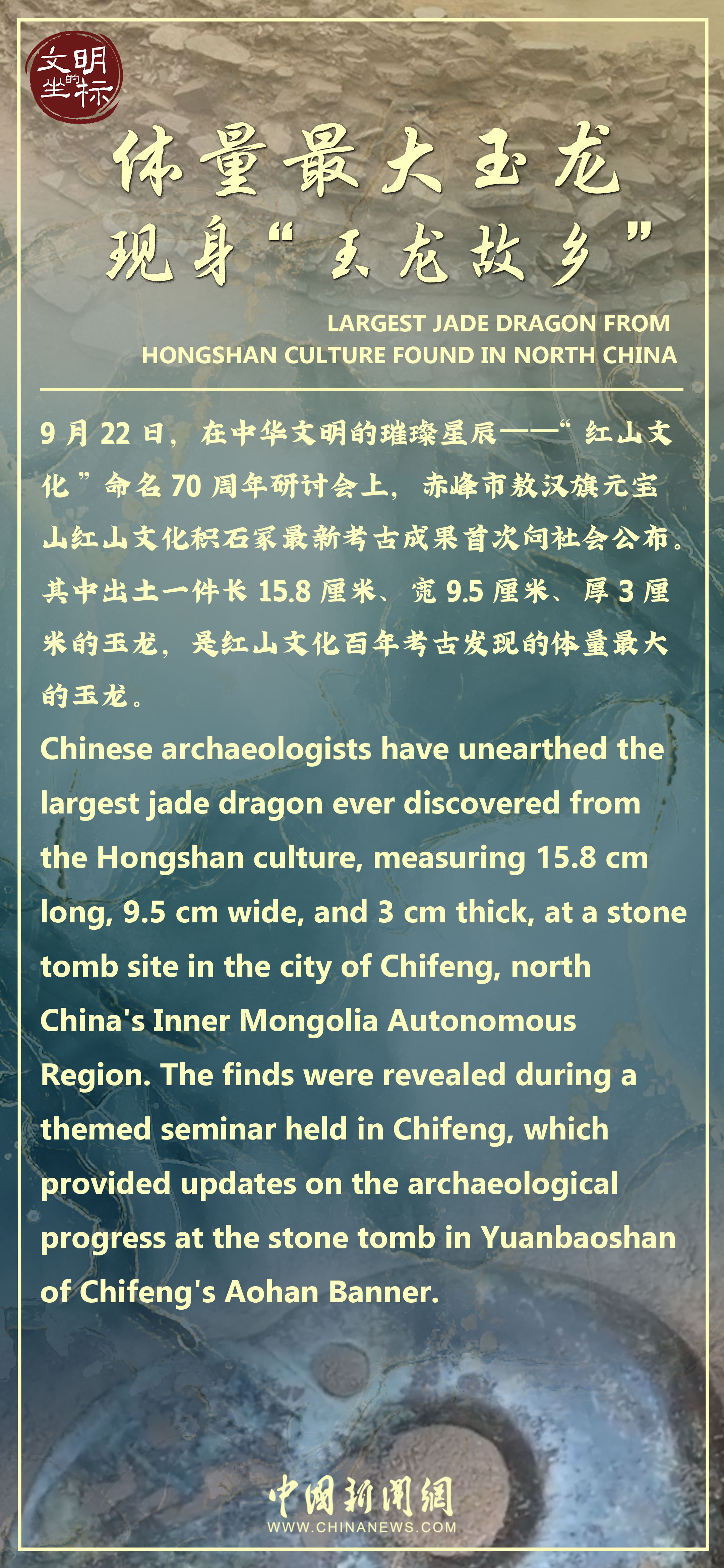 紅山文化因內(nèi)蒙古赤峰市紅山后遺址的發(fā)現(xiàn)、發(fā)掘而得名,至今已有70年。近日,紅山文化考古再一次“上新”。9月22日,赤峰市敖漢旗元寶山紅山文化積石冢最新考古成果首次向社會(huì)公布,其中出土的一件長15.8厘米、寬9.5厘米、厚3厘米的玉龍,是紅山文化百年考古發(fā)現(xiàn)的體量最大的玉龍?!褒垺保袊俗钣H切的身份認(rèn)同,也是紅山文化最突出的元素之一。早在1971年,被考古界譽(yù)為紅山文化象征的“中華第一龍”——紅山碧玉龍?jiān)诔喾迨屑t山文化遺址出土,赤峰市也因此被譽(yù)為“中華玉龍之鄉(xiāng)”。來“玉龍故鄉(xiāng)”,探尋中華文明的古老根脈。