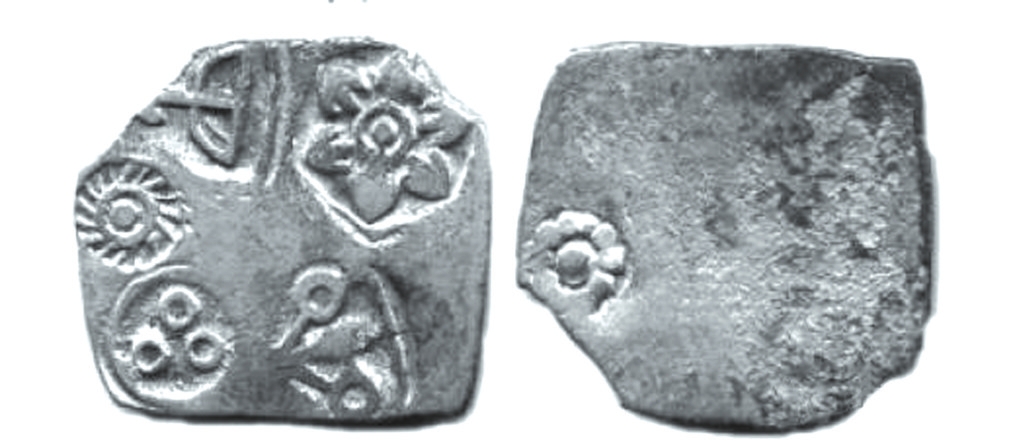 古印度摩揭陀國孔雀王朝時期的卡夏帕那銀幣,似乎可以為亞里士多德的說法提供佐證??ㄏ呐聊倾y幣的具體起源時間不詳,其名源自重量單位“卡夏”,形制為切割成型的銀片或銀塊,正面加蓋戳記作為價值標識,戳記數量通常為一個至六個不等。早期的卡夏帕那銀幣可能由民間或地方勢力發(fā)行,其價值除了依托銀材本身的重量與成色,很大程度上取決于加蓋戳記的發(fā)行人或認證人的信譽背書。