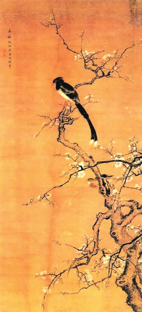 宋代畫家筆下的梅花大都與禽鳥有所關(guān)聯(lián),這主要得益于花鳥畫在此時的繁盛之勢。宋徽宗趙佶的《臘梅山禽圖》就把梅花與白頭翁聯(lián)系起來,描繪了在乍暖還寒的季節(jié)里,兩只相伴而生的白頭翁立于臘梅枝頭的場景,給觀者帶來復(fù)蘇之感。作品左下角題詩“山禽矜逸態(tài),梅粉弄輕柔。已有丹青約,千秋指白頭”,表達(dá)了愛情之思。因為白頭翁在傳統(tǒng)文化中象征吉祥與幸福,是對白頭偕老的隱喻,當(dāng)它與梅花結(jié)合起來時,便會強(qiáng)化人們對美好愛情的聯(lián)想。