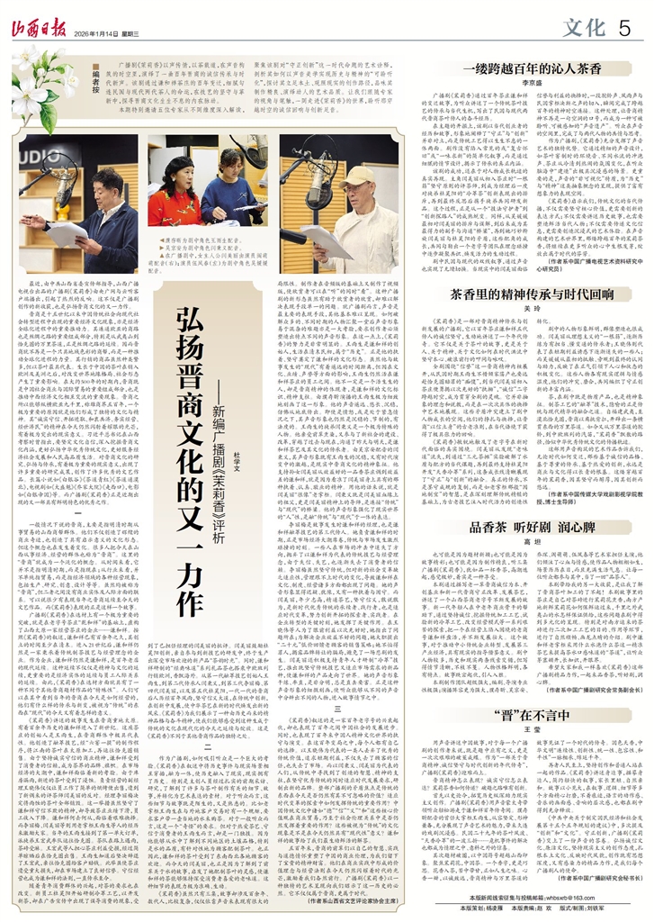 廣播劇《茉莉香》以聲傳情,以茶載道,在聲音構(gòu)筑的時空里,演繹了一曲百年晉商的誠信傳承與時代新聲。該劇通過謙和祥茶莊的百年變遷,細膩勾連民國與現(xiàn)代兩代茶人的命運,在技藝的堅守與革新中,探尋晉商文化生生不息的內(nèi)在脈動。