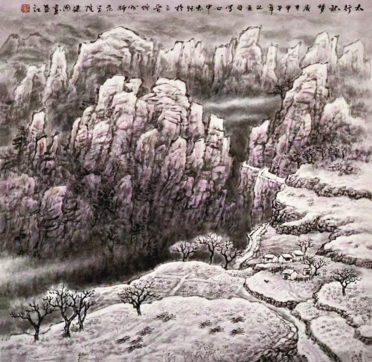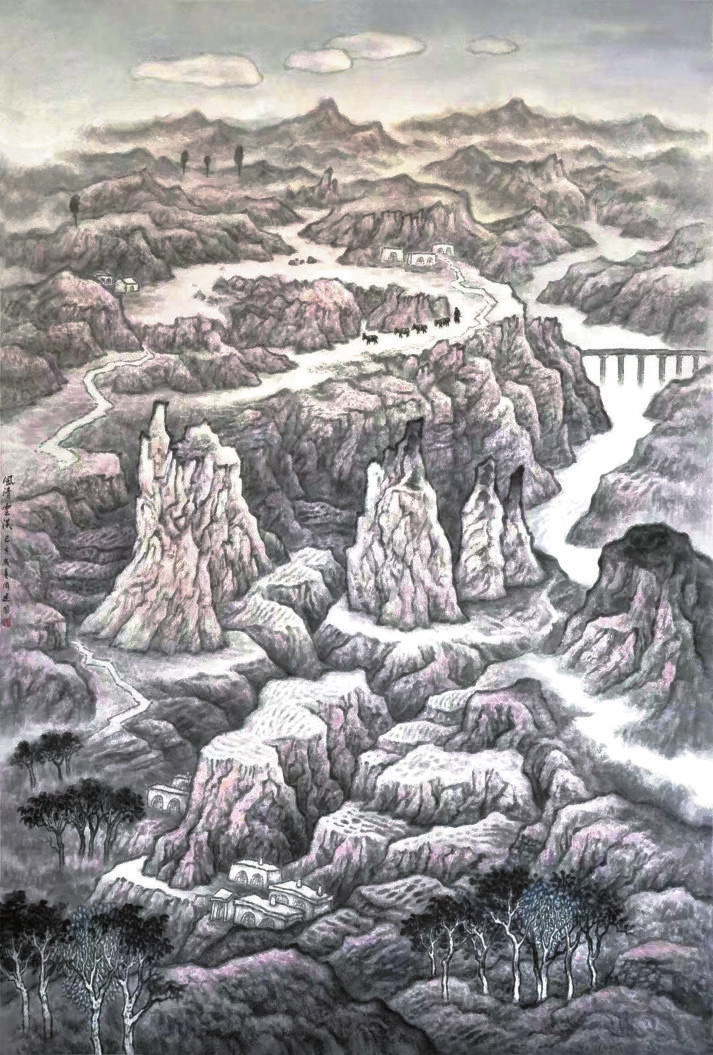 周建國對中國山水畫有著獨特見解,出版過畫集《中國美術名家精品鑒賞·周建國作品集》。他的創(chuàng)作之路主要分為兩個時期,前期追求中西融合,后期則回歸傳統(tǒng)。前期作品《曉月》《古原除夕》《月色》等,多取材于黃土高原,真切流露出其對黃土地的深情厚愛:早上飄起的炊煙演繹著百姓的勤勞,喧鬧的腰鼓彰顯著鄉(xiāng)民熱愛生活的豪情,晨起上課的學生更是承載著當地人滿滿的希望。周建國將黃土地上的一草一木皆升華為獨特且富有個性的生命體,畫面處理側重將西方油畫的光影巧妙融入作品,寓動于靜,動靜相宜,彰顯“高貴的單純,靜穆的偉大”的內在張力。同時將傳統(tǒng)山水繪畫的造型、空間結構、筆法設色皆進行改變——黃土溝壑的幾何化處理、筆墨色調的反復拿捏、耐人尋味的空間布局,都體現(xiàn)了其特殊的創(chuàng)作理念。相較前期,周建國后期的作品更加注重對內在美的挖掘,如《風月同天》《家園》《和諧家園》《生息之地》《太行月色》等代表作品,表達對祖國山河大川的熱愛,走“外師造化,中得心源”之道,畫風趨向率真,試圖突破中國山水繪畫的表象審美,追尋深層意義的表達。