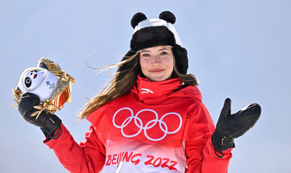 2022年2月18日,谷愛(ài)凌在北京2022年冬奧會(huì)自由式滑雪女子U型場(chǎng)地技巧頒發(fā)紀(jì)念品儀式上。新華社記者肖藝九攝