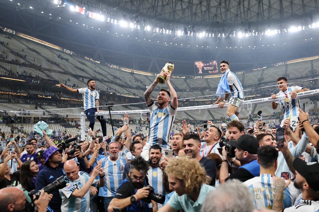 2022年12月18日,阿根廷隊(duì)球員梅西(上左二)在比賽后手捧大力神杯慶祝。新華社記者曹燦攝