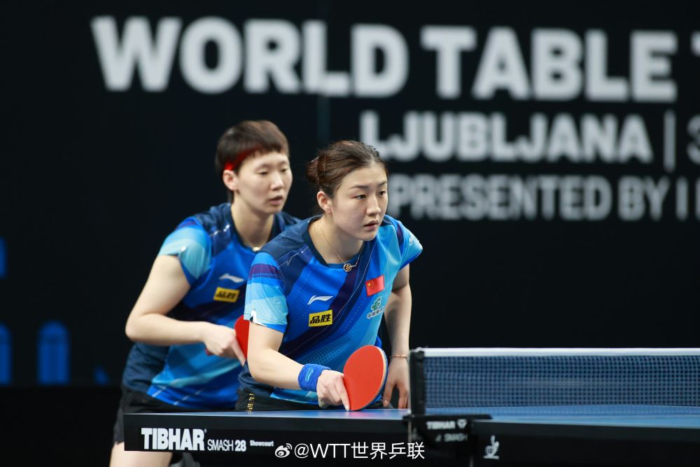 陳夢(mèng)(前)、王曼昱在比賽中。圖片來(lái)自WTT社交媒體官方賬號(hào)