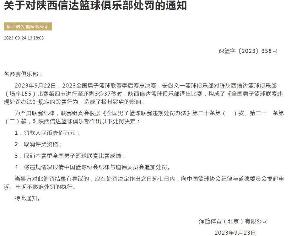 中國籃協(xié)官網(wǎng)公布的“關于對陜西信達籃球俱樂部處罰的通知”