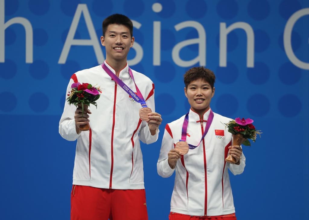 10月7日,杭州亞運會羽毛球混雙季軍馮彥哲/黃東萍(右)在頒獎儀式上。新華社記者 陳斌 攝