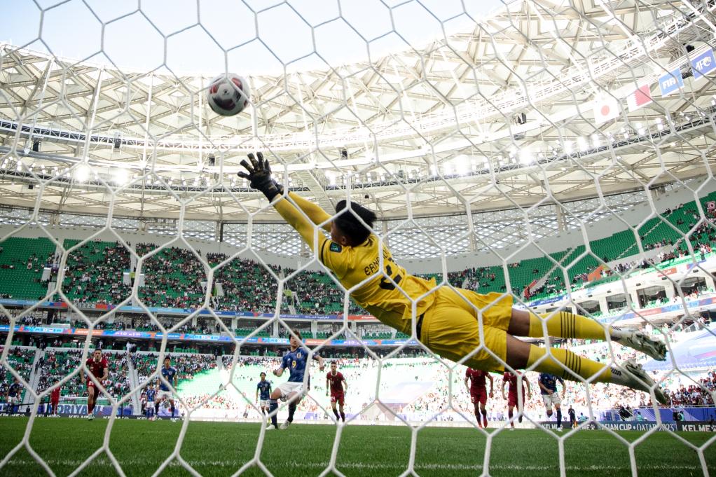 1月24日,印尼隊守門員埃爾南多·阿里·蘇塔爾亞迪(前)在比賽中未能撲出日本隊球員上田綺世的點球。新華社記者 江漢 攝