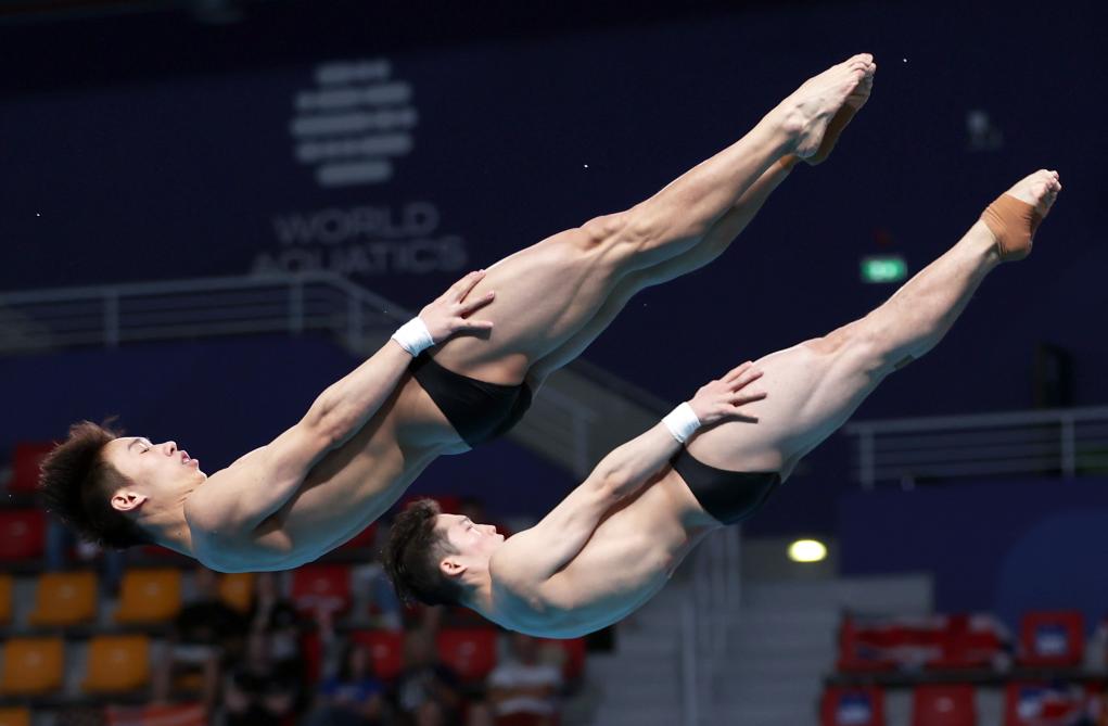 男雙3米板決賽中,王宗源/龍道一以442.41分的成績(jī)奪冠。這是王宗源繼2022布達(dá)佩斯、2023福岡后,第三次奪得世錦賽該項(xiàng)目冠軍。意大利組合馬爾薩利亞/托奇、西班牙組合阿瓦迪亞/博伊西爾分獲亞軍和季軍。
