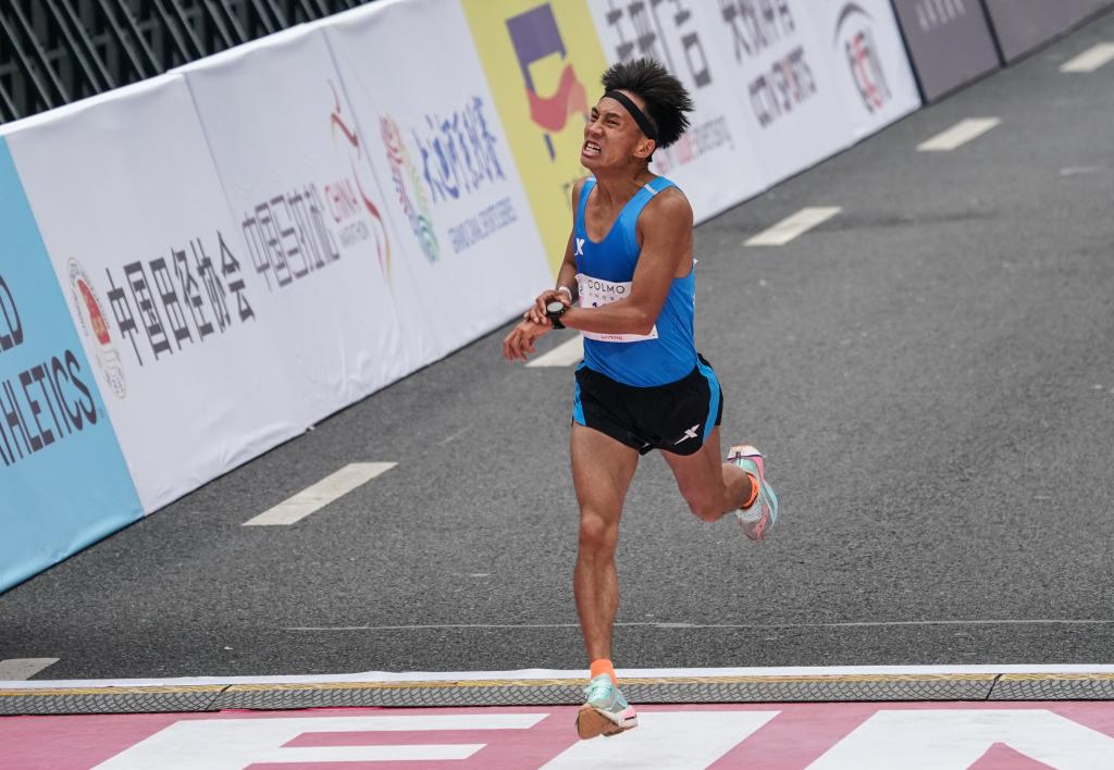 2023年3月19日,何杰在無(wú)錫馬拉松比賽中沖過終點(diǎn)。新華社記者 楊磊 攝