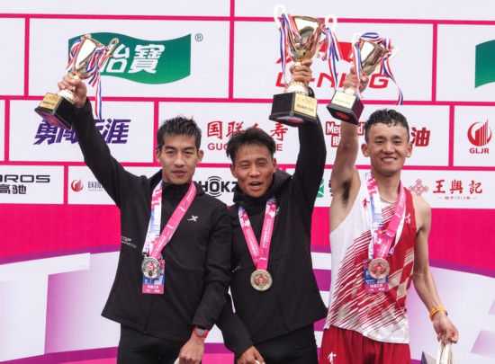 3月24日,冠軍何杰(中)、亞軍楊紹輝(左)和季軍桑吉東知在全國馬拉松錦標賽(第一站)男子組頒獎儀式上。新華社記者 楊磊 攝